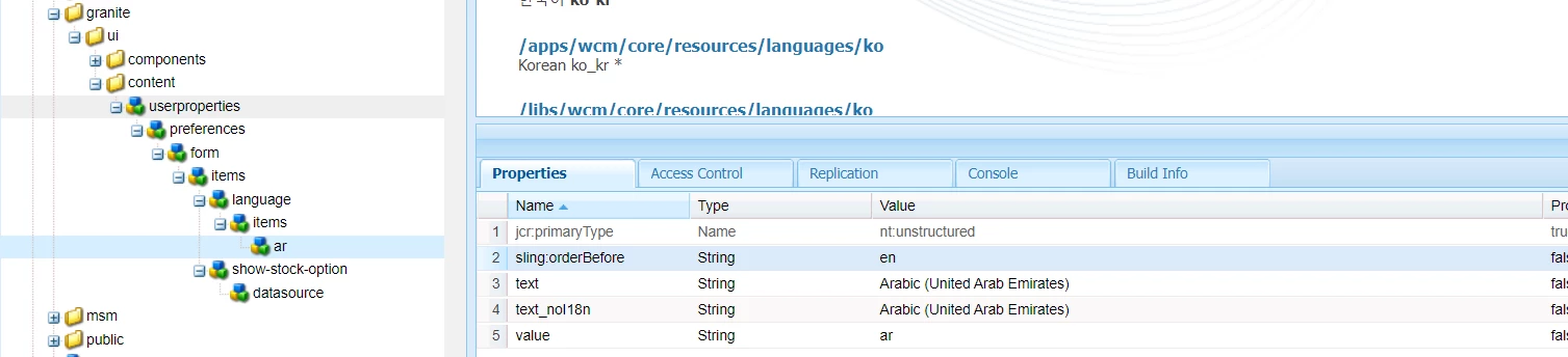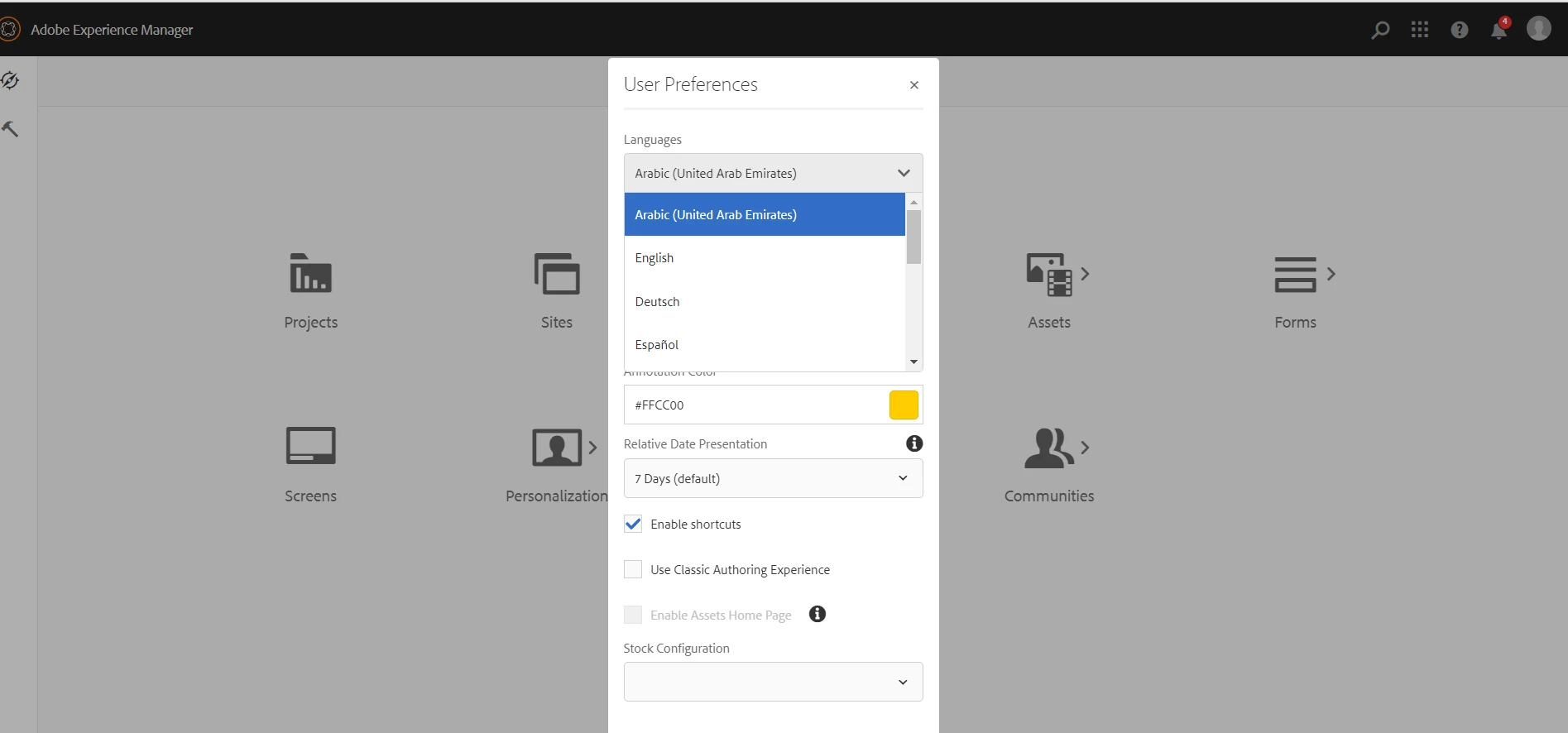 By default there is a short list of languages that a user can navigate AEM with. Most of our users are able to navigate AEM in English, French or Spanish. We have a need to allow the Arabic language for navigating AEM, how do I go about getting the Arabic language added as a selection? I assume I'll need to upload some language pack but I can't figure out where a resource would be for that.