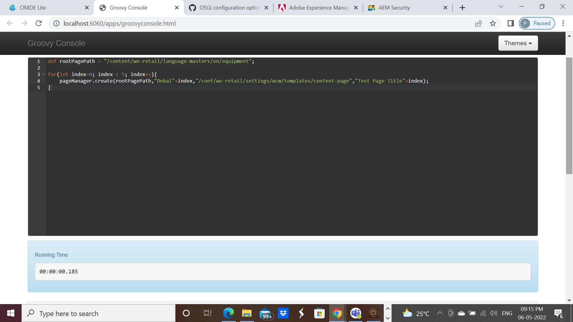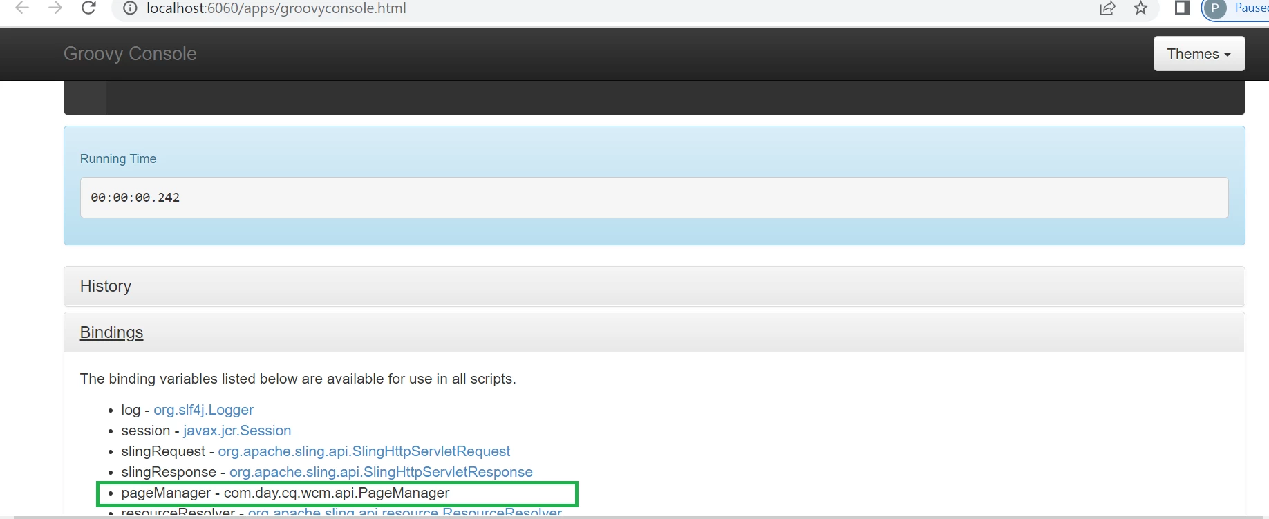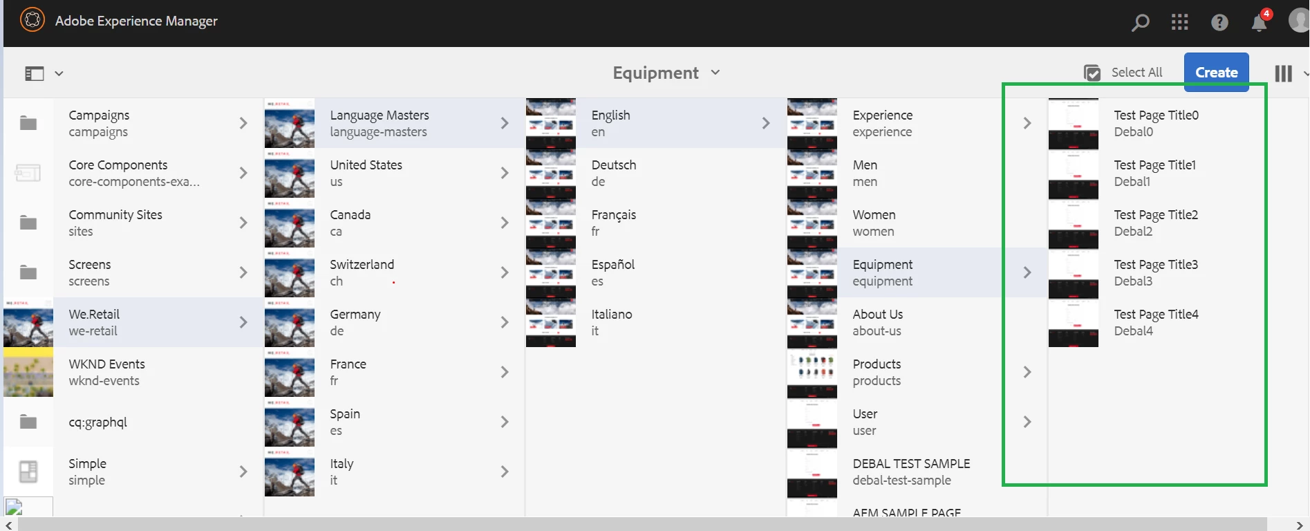 pageManager.create(rootPagePath,"Debal"+index,"/conf/we-retail/settings/wcm/templates/content-page","Test Page Title"+index);