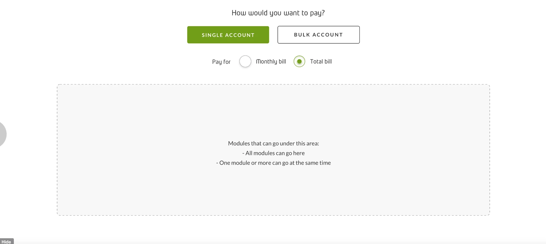 When I click each filter, it should show different modules. And the class also should change like <div class="monthly bill"> and <div class="total bill">
