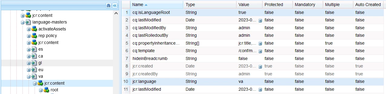 A screenshot showing we can set the jcr:language property of a page to "va".