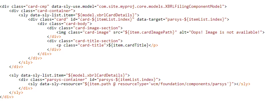 I am working on a use case, but stuck at one point that i have created a multifield component where we can create multiple cards shown in the below image. But as soon as these cards are created it should also have individual parsys below it for each card. The parsys should get add dynamically for each card. and the content added into the parsys should be hide and show based on the click on that card. but Here i am not able to add the parsys itself. Please help here.