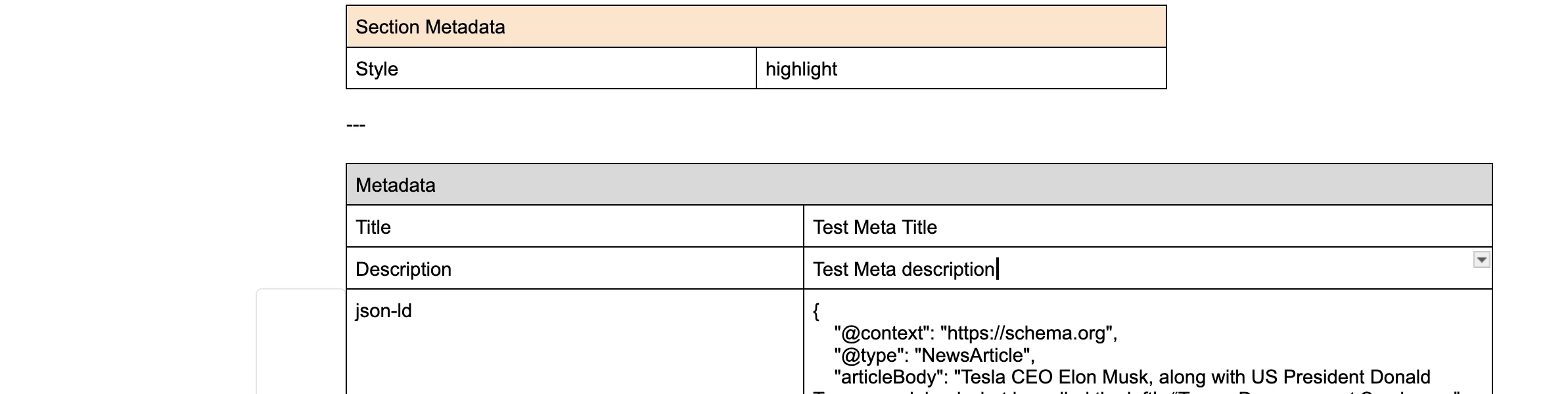 we are trying to add seo schema to our page, Adobe's documentation suggests to use json-ld to author seo schema, but I am clueless on how to add it as a property to page.json. Whenever I tried to add it as a property to page.json, the content which I author in that page is being rendered as a meta tag with name property which I have defined in page.json. It is not rendering as script tag as it was mentioned in documention.