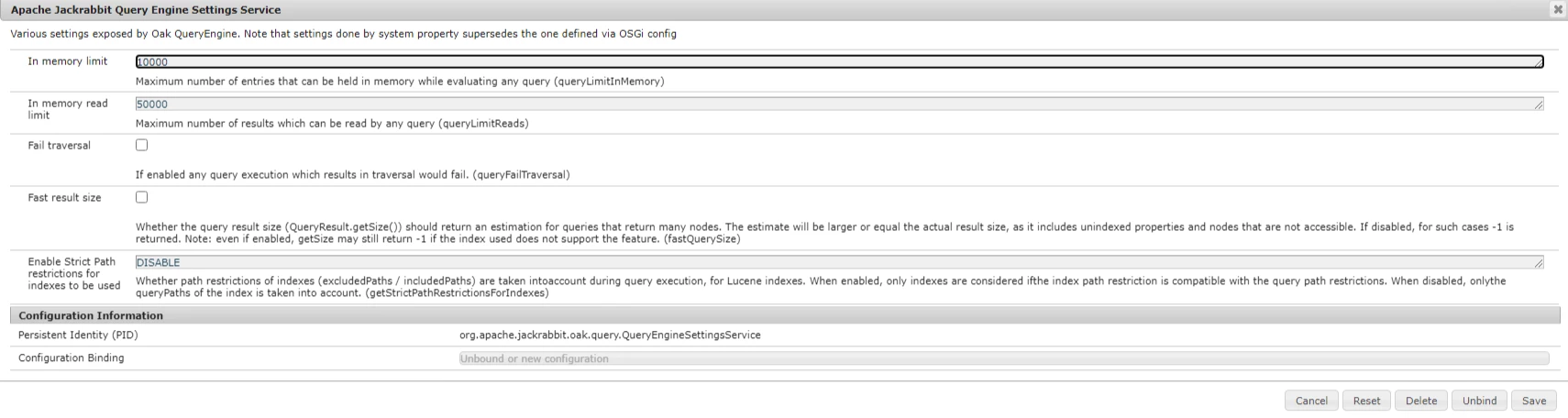 3. In your /system/console/configMgr, change the number of in-memory limit.
