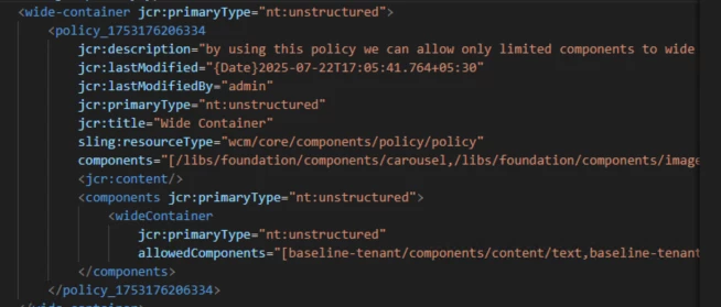 I have contaner component, for that container I need allow few list of components, for that I have created a component with cq:designDialog with allowed component. in html I added parsys below are the files.