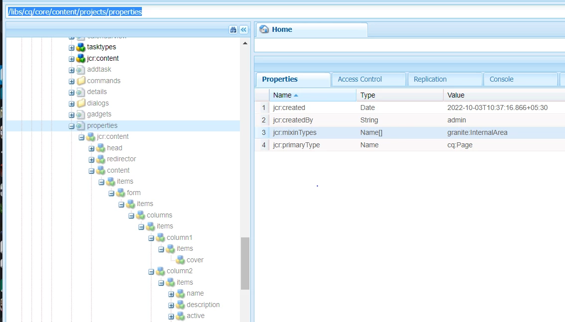 I want to Override node which is of type "granite:InternalArea" under path :/libs/cq/core/content/projects/properties