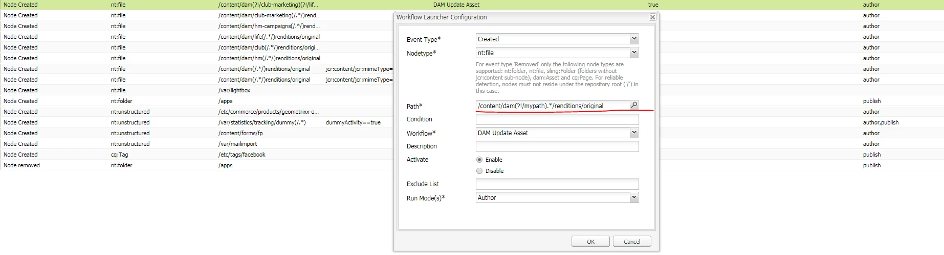 How can I disable DAM Update Asset workflow for a specific path?