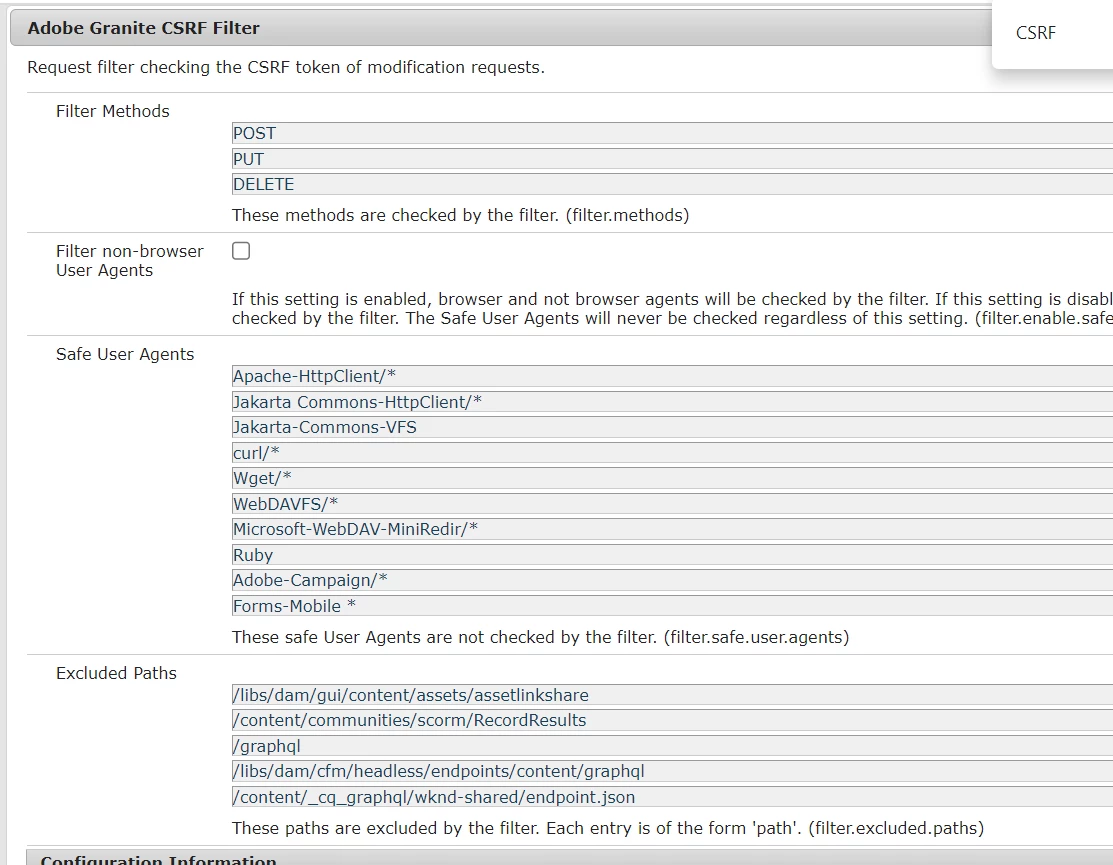- The configuration name is com.adobe.granite.csrf.impl.CSRFFilter