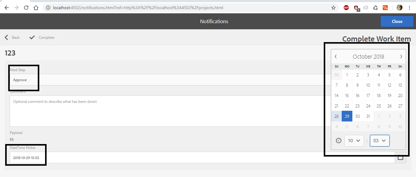 I done customization in complete Work Item added Date Time picker.