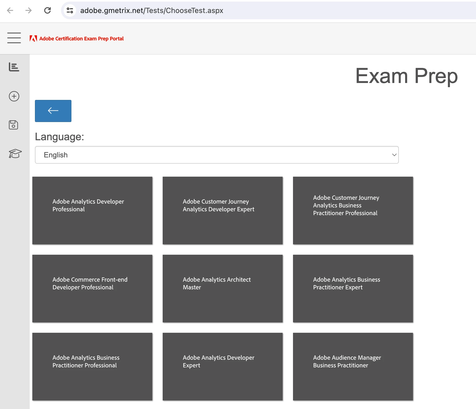 Select the 'Language' & then the 'Adobe Icon' below, you will see list of practice tests available
