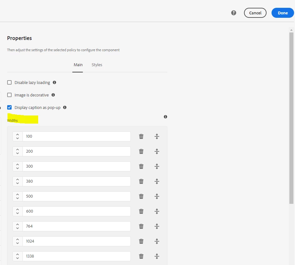 Now I am trying to hide OOB width i.e. /libs/core/wcm/components/image/v3/image/cq:design_dialog/content/items/tabs/items/properties/items/content/items/widths