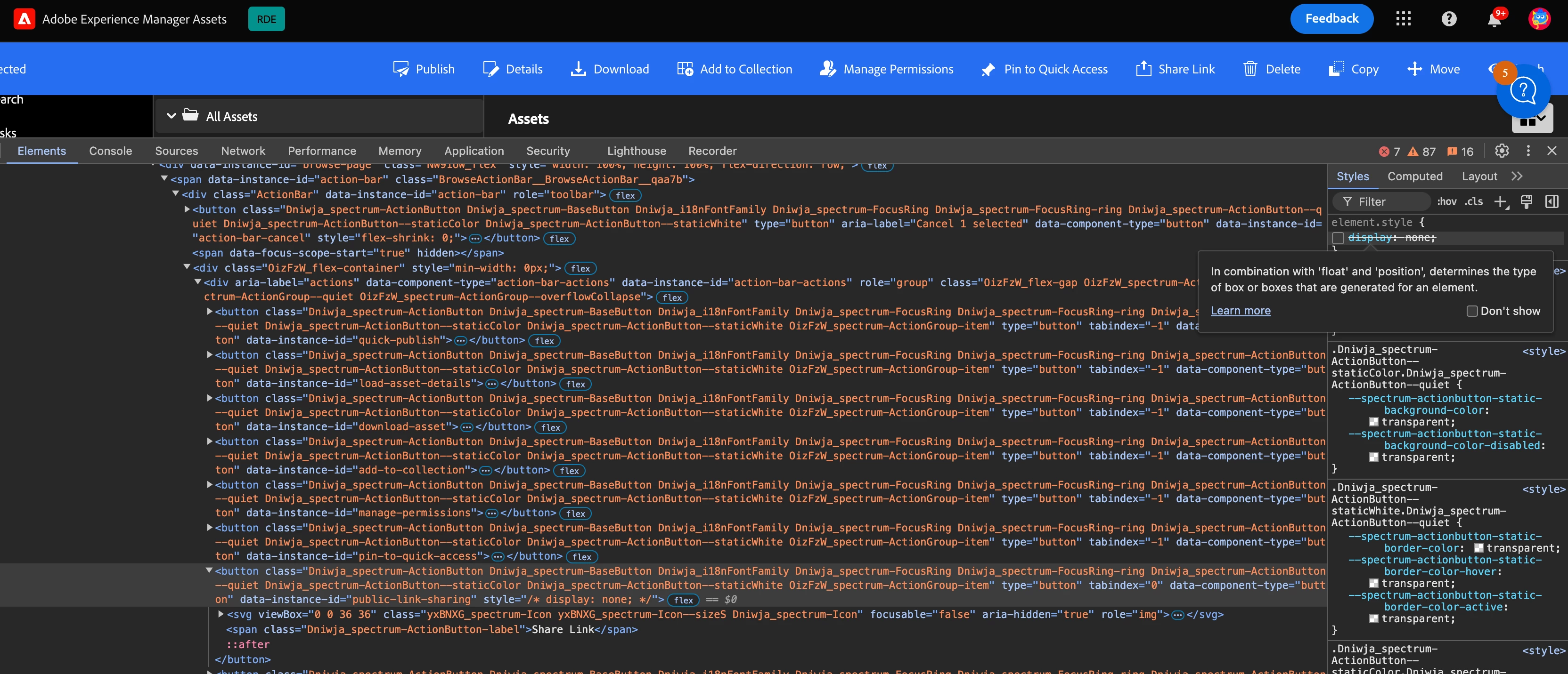 This configuration works correctly in the Assets Admin view. However, the "Share Link" button is still visible in the Assets view.