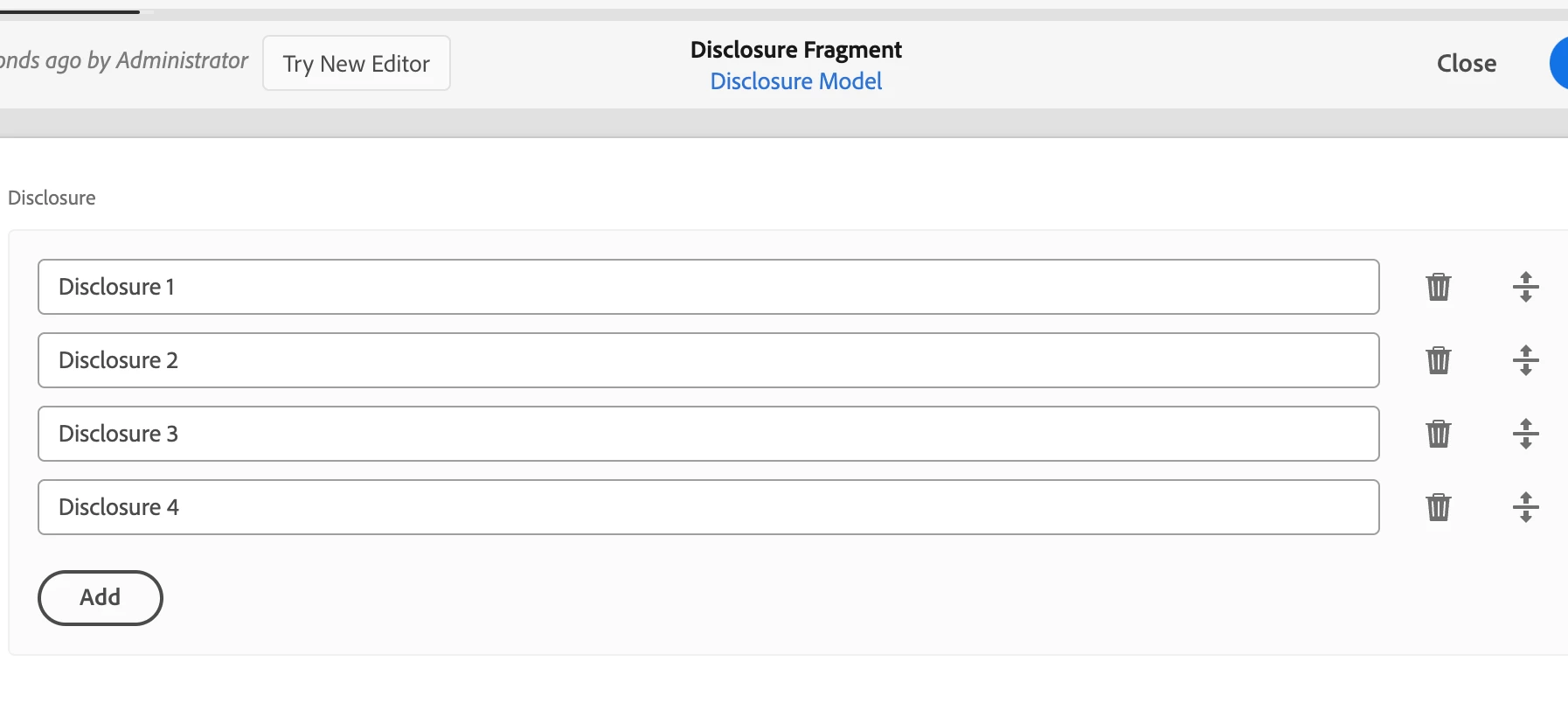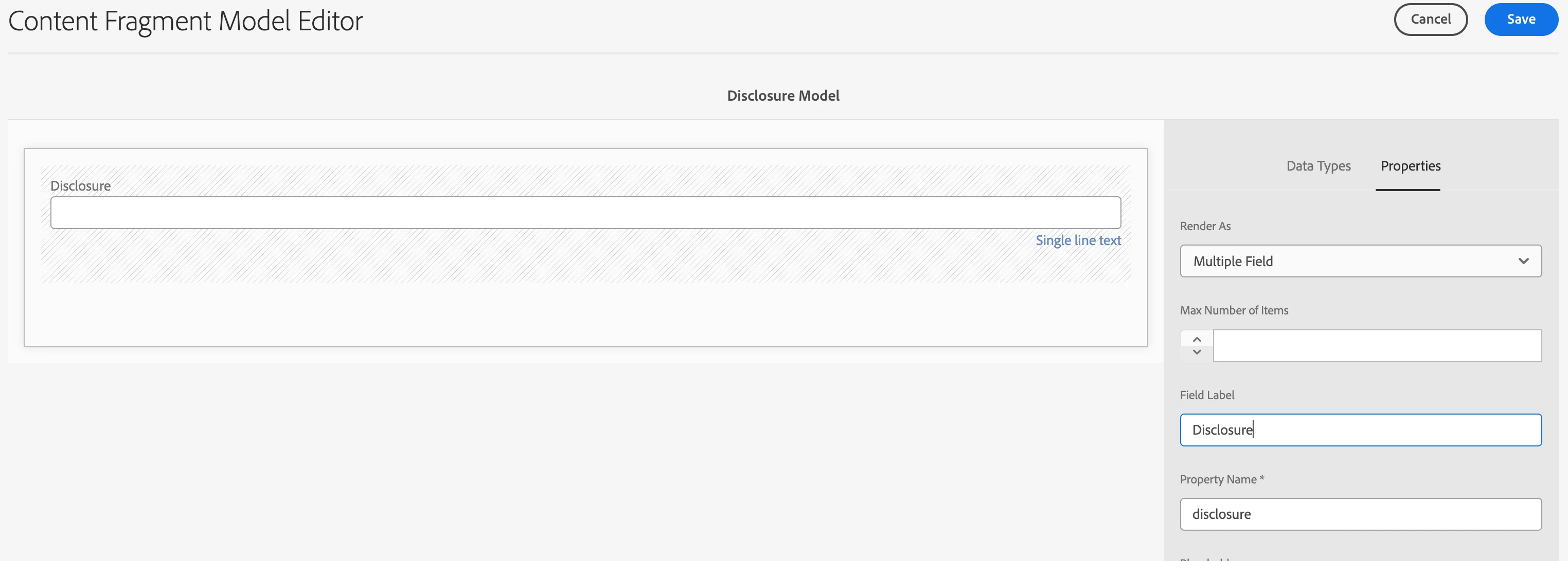Step 3) Create a content fragment as a dropdown for Editor to select multiple Disclosures to add