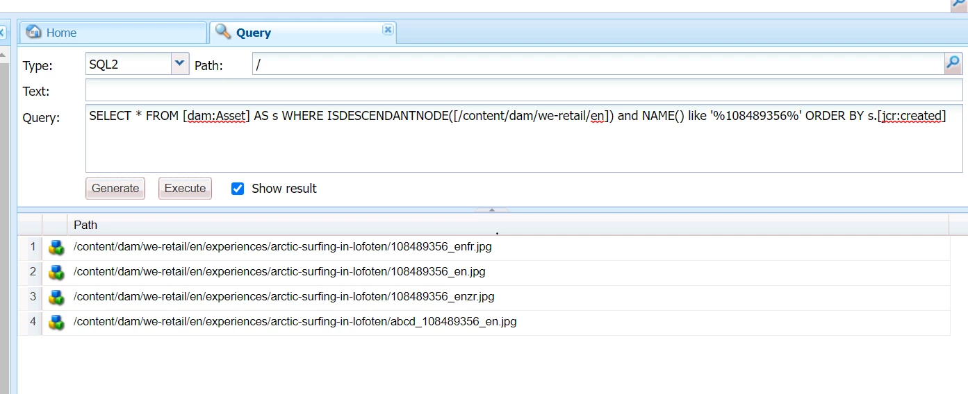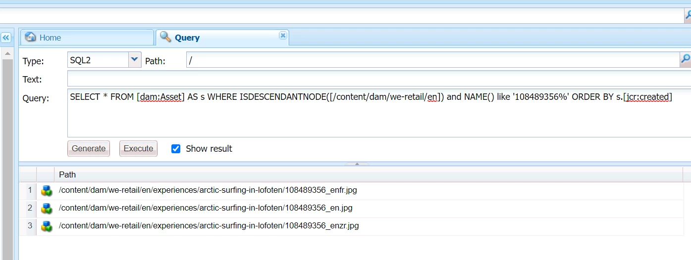 SELECT * FROM [dam:Asset] AS a WHERE ISDESCENDANTNODE(a,[/content/dam/some-company/creative-assets/automobiles/offers]) AND a.[jcr:path] LIKE '%/108489356_en.jpg' ORDER BY a.[jcr:created]