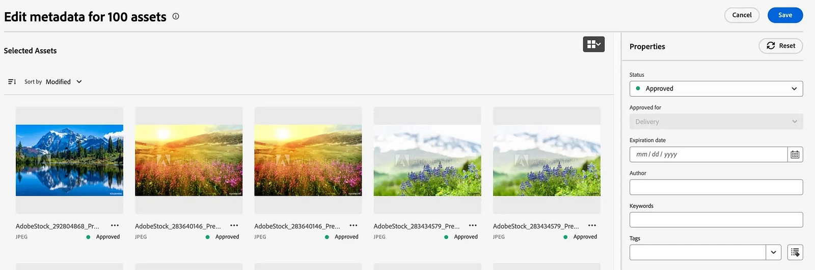 The Bulk Metadata Edit feature within the AEM Assets allows users to edit a predefined set of standard metadata fields for multiple asset files simultaneously. Select multiple assets and bulk update their predefined set of standard metadata at once rather than updating that standard metadata for each asset individually. This feature enhances the efficiency, consistency, and accuracy of standard metadata properties across a large set of assets, improving asset searchability and organization.