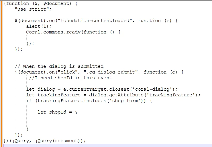 I need to pass a value from my Sling Model, for example shopId to my clientlib js associated with the AEM dialog. Following is my clientlib js for aem dialog.