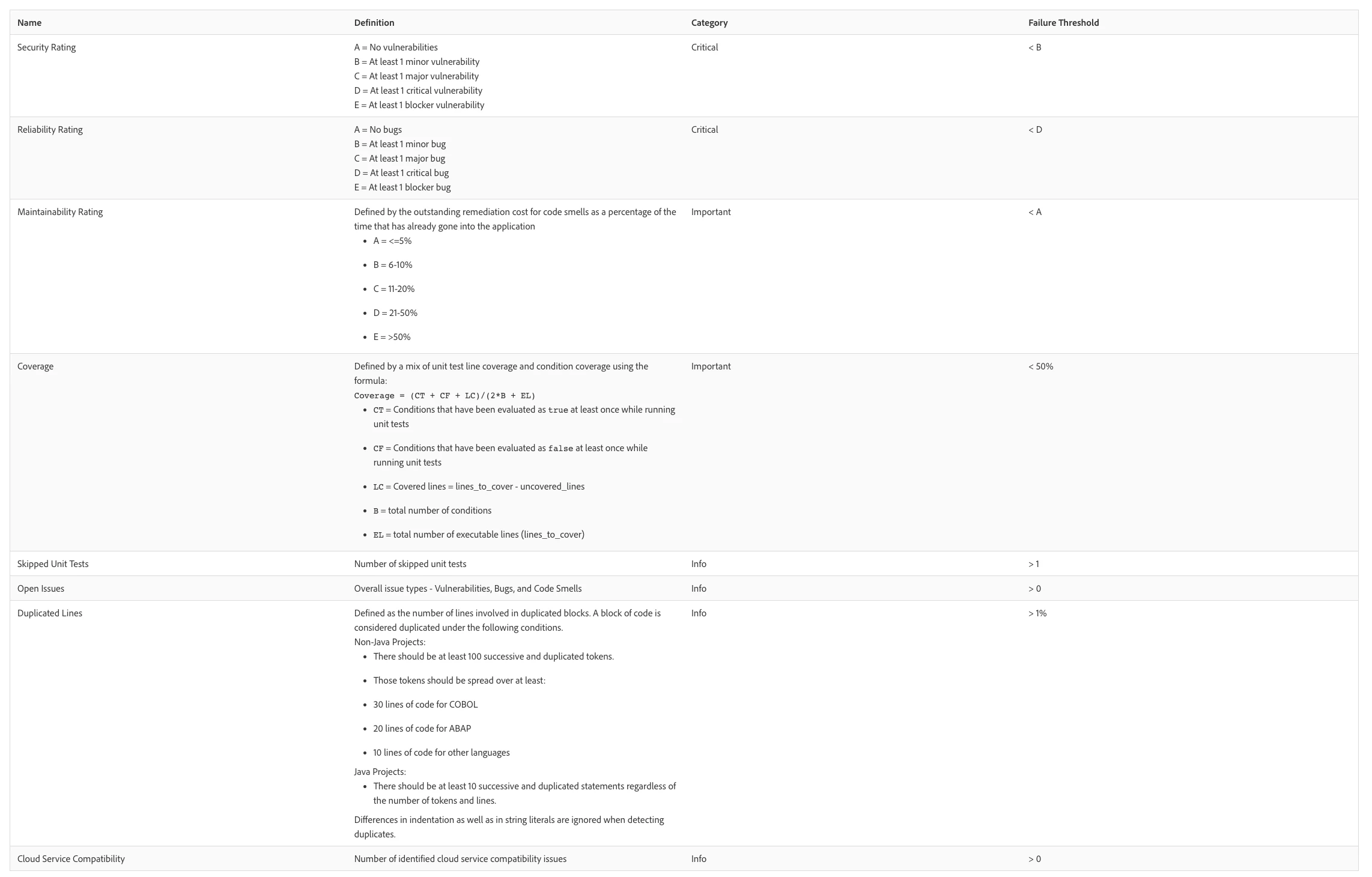 In order to achieve an Security Rating of A or better, the code base must not have any Vulnerability issues with a severity of Minor or higher.
