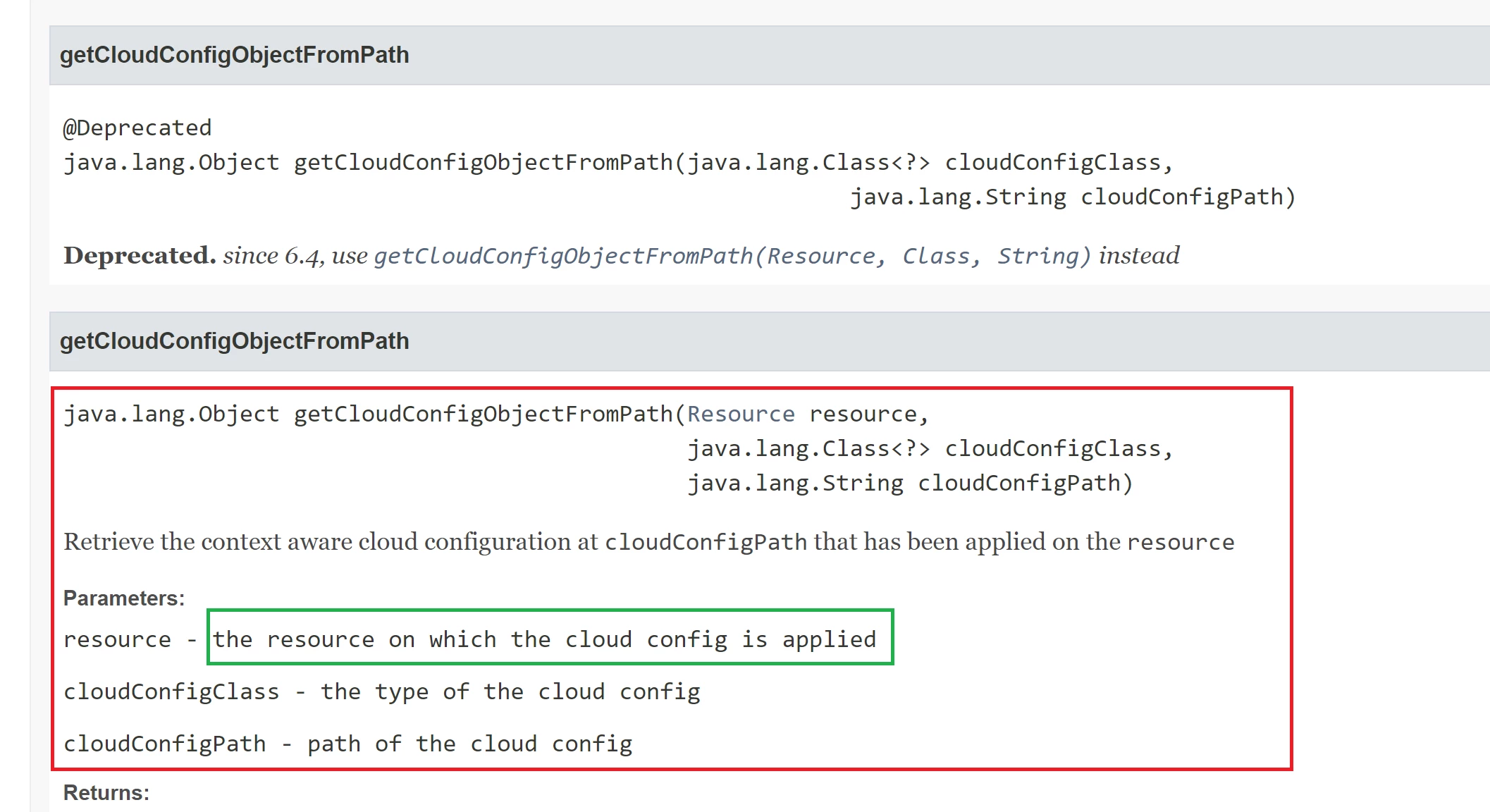 Per the updated method description in below link, value for Resource should be the site root page in which cloud config is applied.
