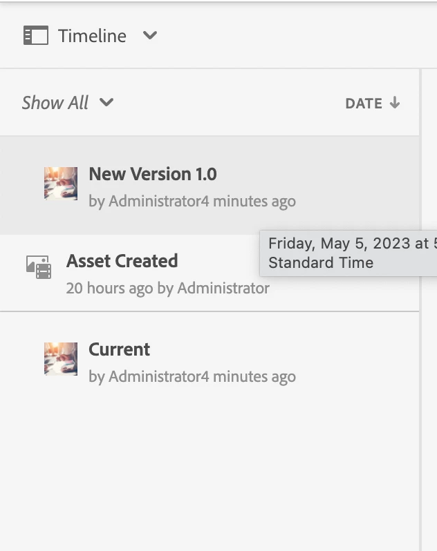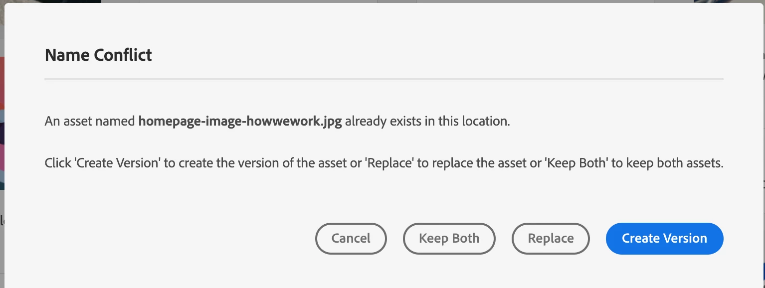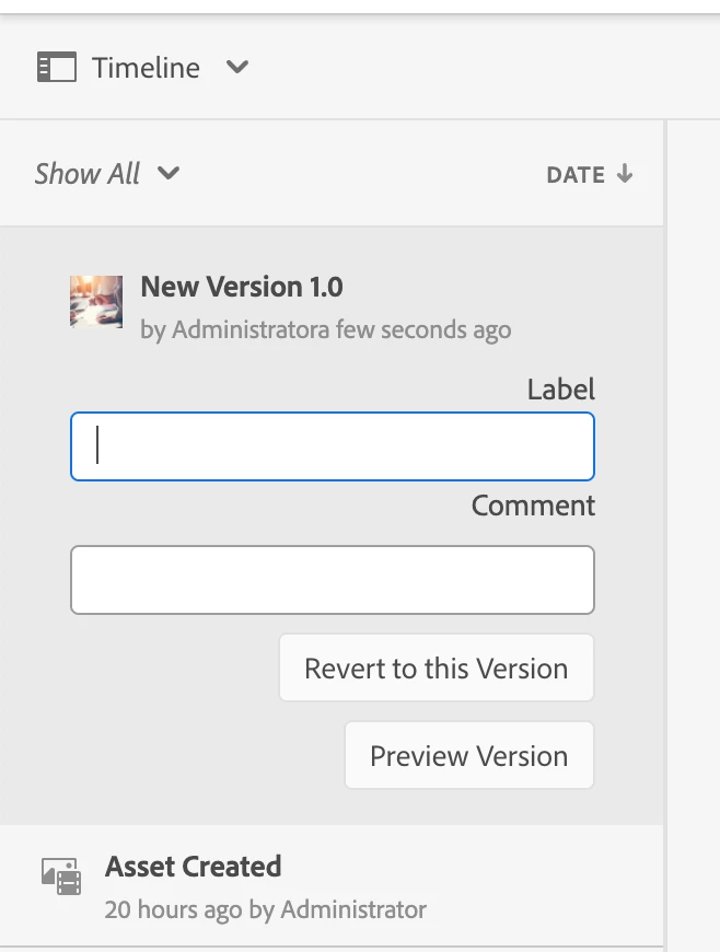 We could see when we re-upload an existing asset in DAM, A Name Conflict dialog opens to save the asset as Version using "Create Version" button. In Timeline, it shows default Label/Comment as "New Version 1.x".