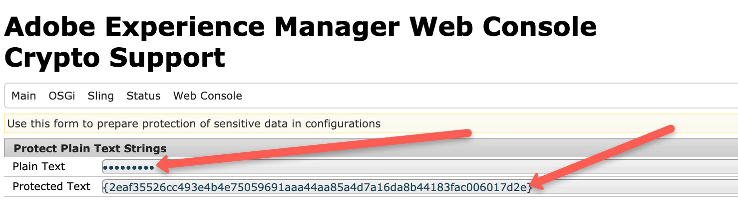 This feature allows all OSGi configuration properties to be stored in a protected encrypted form instead of clear text. The form intheWeb Console UI is used to create encrypted text from clear text using the system wide encryption master key.