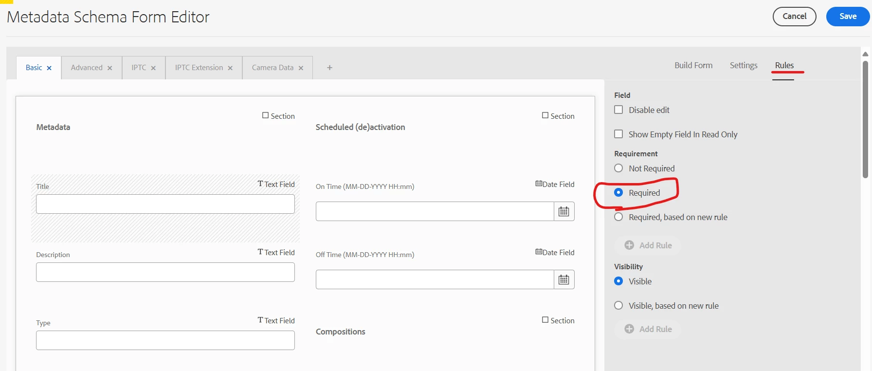 How to unlock the default metadata in aem cloud and make the title and description fields as mandatory without creating a custom metadata schema.