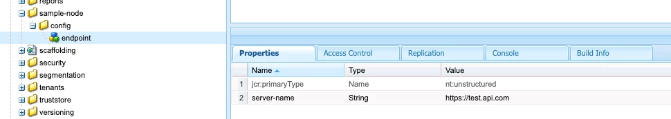 curl -u admin:admin -F _charset_=utf-8 -F key=server-name -F value=server-name-value http://localhost:4502//etc/sample-node/config/endpoint/