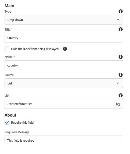 The Core Form Options component has a dialog field called Source which allows you to select a list of nodes from the path browser to make up the options in a dropdown list.