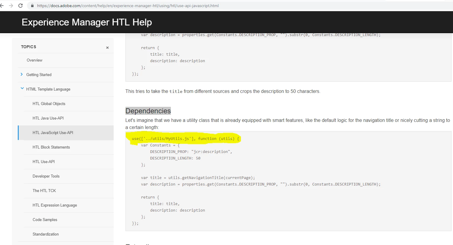 What's the correct way to access "Dependencies" in HTL js file?