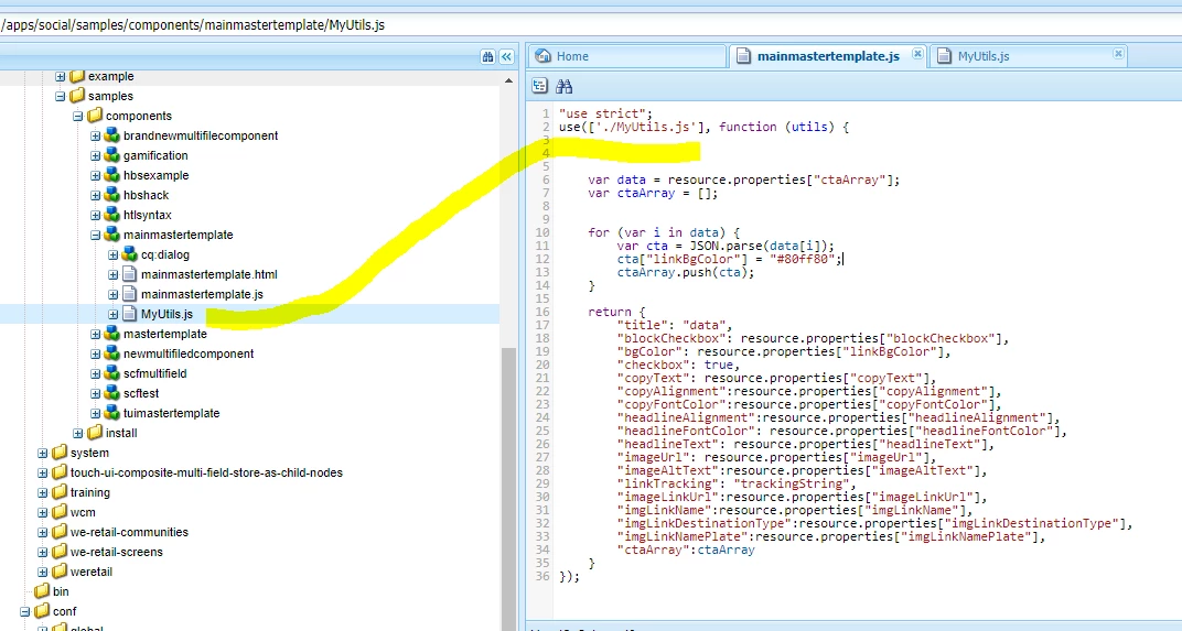 org.apache.sling.scripting.sightly.SightlyException: javax.script.ScriptException: Failure running script /apps/social/samples/components/mainmastertemplate/mainmastertemplate.js: Required script resource could not be located: ./MyUtils.js. The caller is /apps/social/samples/components/mainmastertemplate/mainmastertemplate.js