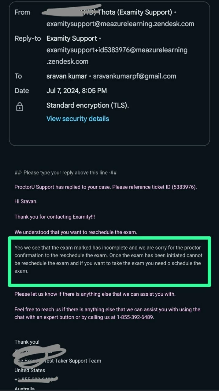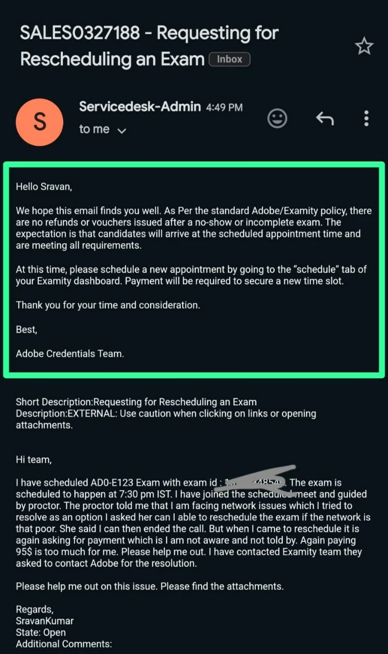 This is my first time to take AEM DEVELOPER PROFESSIONAL CERTIFICATION exam. I joined the exam call via Zoom meeting where the proctor from Examity team frequently mentioned that I have poor connection even though changed different networks. So I asked her is there a chance that I can reschedule my exam and she said yes you can and ended the exam test. But when I went to portal to reschedule it says that I need to pay for rescheduling which I am not aware and not told by the proctor. I have contacted support@examity.com they mentioned that we only monitor the exam and we don't have access to reschedule this point was not clearly mentioned by the proctor in the zoom meeting.
