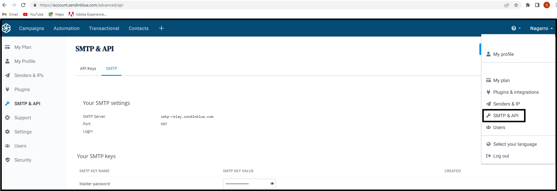 For getting the SMTP details, use the link https://account.sendinblue.com/advanced/api