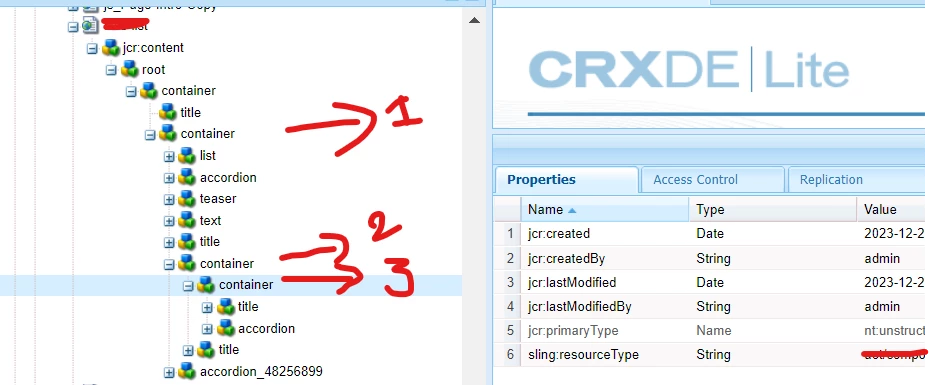 As shown in picture there are some "container" nodes having components inside. For every container node it should get node of the component and add to a java map of values title and heading of the node