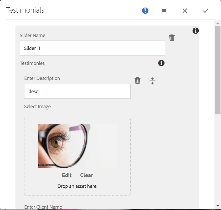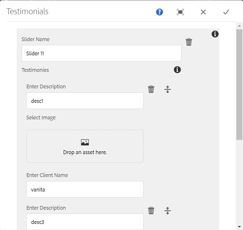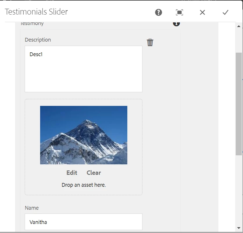 I am trying to do nested multifield with Text and Image. I have created the dialog like the below and the values are stored in crxde. And I'm using sling model to display those multifield values on page. Text values are displaying but not the image . Can anyone help me. How to display image into page using Sling model in multifield.
