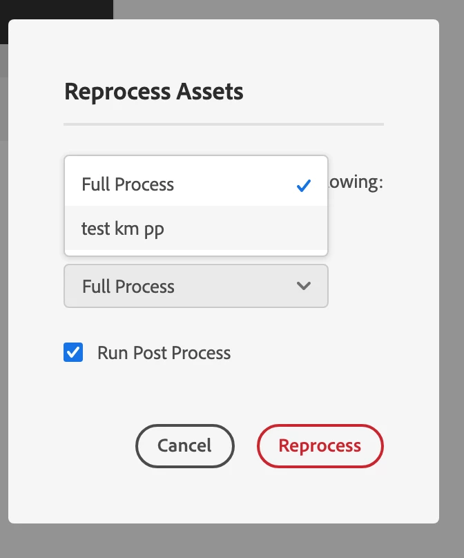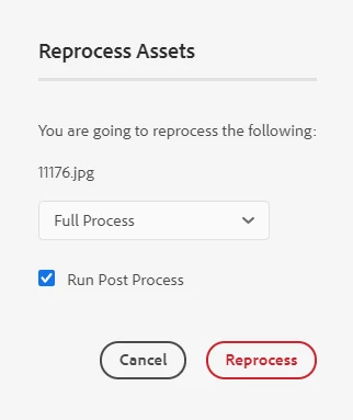 | Use-case: | Select an asset or folder and then hit reprocess. In the reprocessing dialog, the only option is "Full process". It will be good if there is an option to reprocess --- metadata, presets, smart crops |
