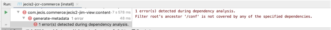 Filter root's ancestor '/conf' is not covered by any of the specified dependencies.Not sure if the error message makes sense, since I have no dependencies on the view (or ui.apps). This behavior was reported already for the vault plugin 0.5.4.