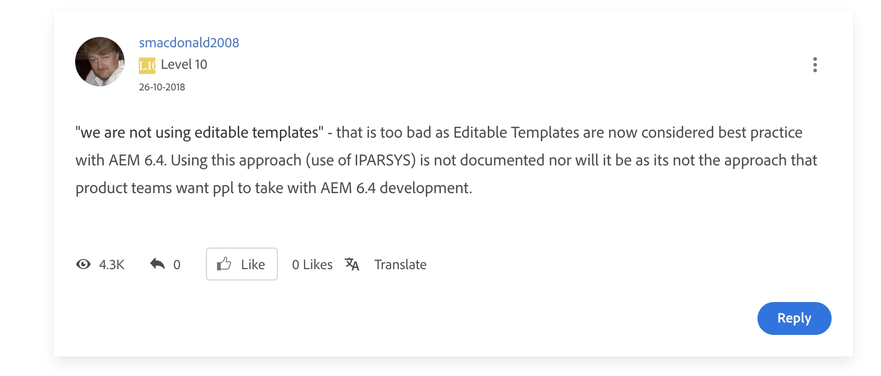 The fact is, Iparsys works in editable template in the same how it works in static template but it may not function properly when you are in editable template but the same will work in actual page. Can you one tell if it is really not recommended to use in editable template? If so please point me to adobe documentation.