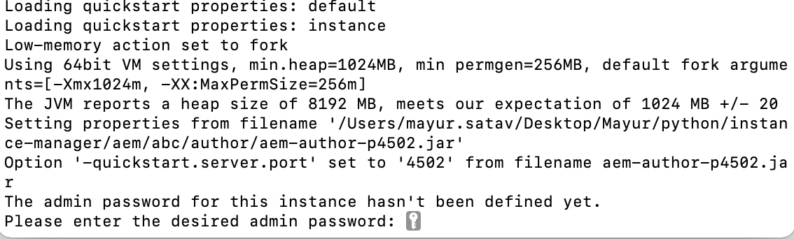 When we install AEM instance through terminal with the help of java -jar aem-author-p4502.jar command, it asked for admin password as shown in below screenshot