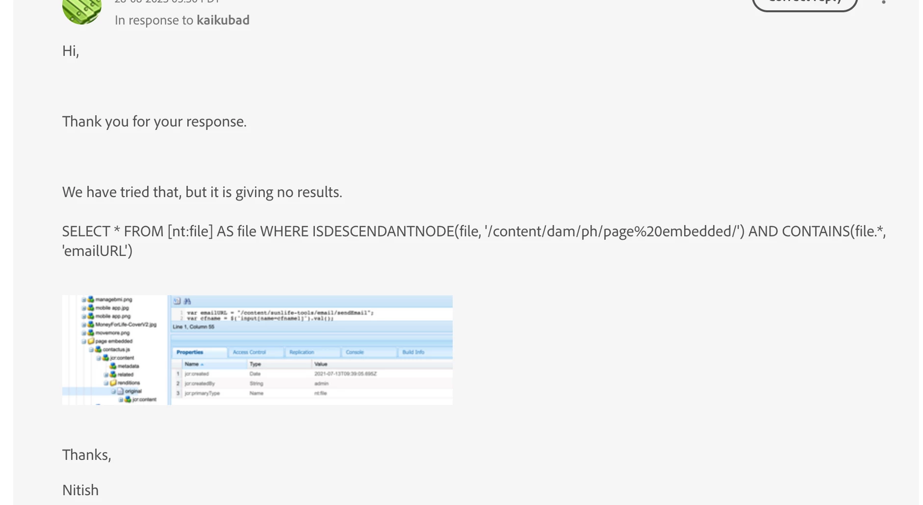 I want to search for a keyword in Javascript files that exists as DAM file in AEM. Javascript are saved as nt:file and data resides in jcr:data, is it possible to search for a keyword in these? With xPath or SQL2? Any other options for suggestions?