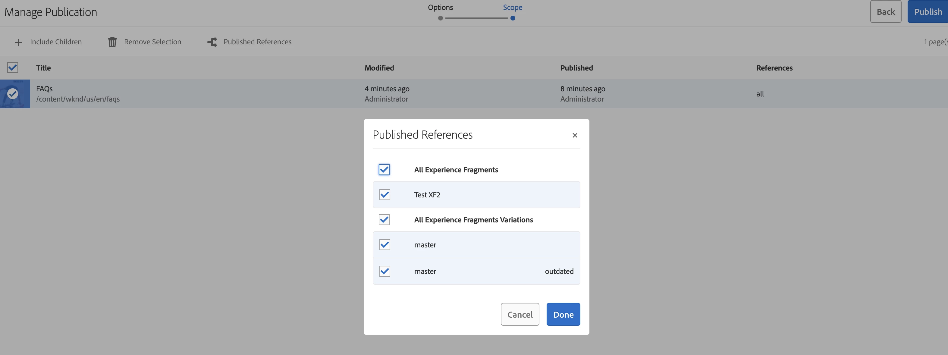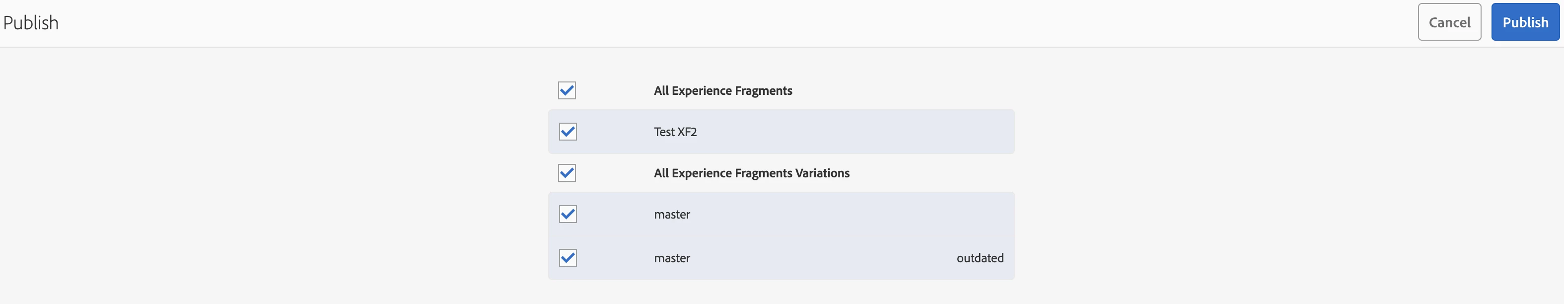 I have made partial changes to an experience fragment and authored it within a page. Now, I am attempting to publish the page using the quick publish option, but I do not want the experience fragment to be included in this replication. Is there any OOTB feature available to accomplish this?