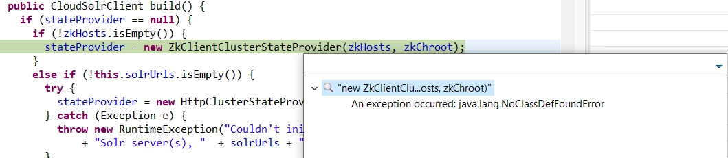 java.lang.NoClassDefFoundError: org/apache/zookeeper/KeeperException at org.apache.solr.client.solrj.impl.CloudSolrClient$Builder.build(CloudSolrClient.java:460) at com.bdb.aem.core.servlets.SolrConnection.getConnection(SolrConnection.java:36) at com.bdb.aem.core.servlets.SolrConnection.doGet(SolrConnection.java:29) at org.apache.sling.api.servlets.SlingSafeMethodsServlet.mayService(SlingSafeMethodsServlet.java:266) at org.apache.sling.api.servlets.SlingSafeMethodsServlet.service(SlingSafeMethodsServlet.java:342) at org.apache.sling.api.servlets.SlingSafeMethodsServlet.service(SlingSafeMethodsServlet.java:374)