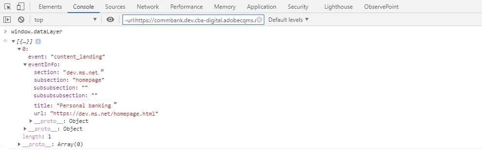 Please find the below browser console - From the dataLayer object, there is n't any subsubsection or subsubsubsection and we are seeing empty values for the both. (Actual Result)