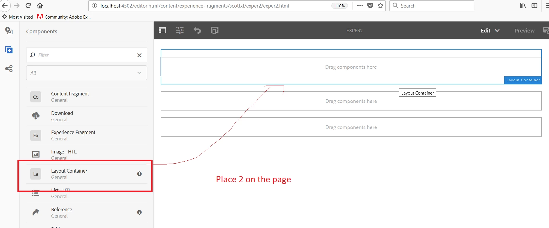 Now, when i try to consume this experience fragment into a page, the page looks as below:
