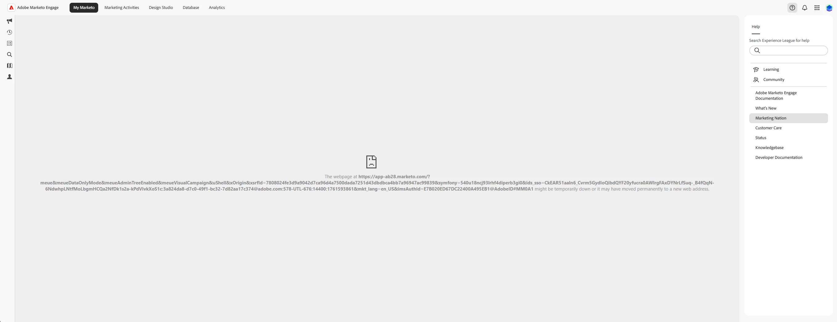 Hi, I'm having an issue trying to get anything to load in Marketo Engage. When I log into Marketo or click on a link that should go directly to a Marketo program, I get the following error message: "The webpage at https://app-ab28.marketo.com/?meue&meueDataOnlyMode&meueAdminTreeEnabled&meueVisualCampaign&uShell&xOrigin&xsrfId=7808024fe3d9a9042d7ca96d4a7500dada7251d43dbdbca4bb7a96947ac99839&symfony=540u18ncj93lrhf4diperb3gi0&ids_sso=CkEAR51aaln6_Cvrm5GydIoQibdQYF20yfucra0AWlrgFAxDYNrLfSuq-_B4fQqN-6NdwhpLNtfMoLbgmHCQa2NfDk1s2a-kPdVIvkXoS1c:3a824da8-d7c0-49f1-bc32-7d82aa17c374@adobe.com:578-UTL-676:14400:1761593861&mkt_lang=en_US&imsAuthId=E7B020ED67DC22400A495EB1@AdobeID#MM0A1 might be temporarily down or it may have moved permanently to a new web address."