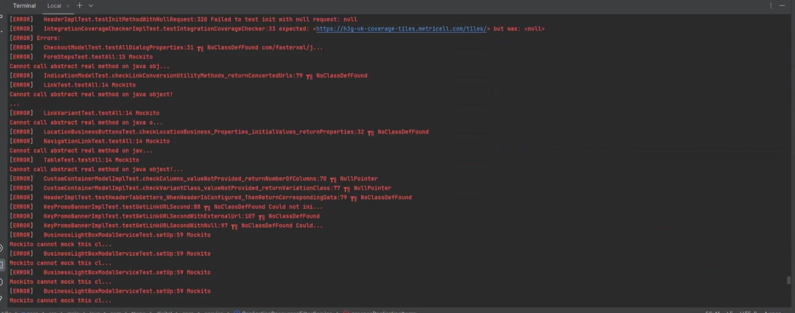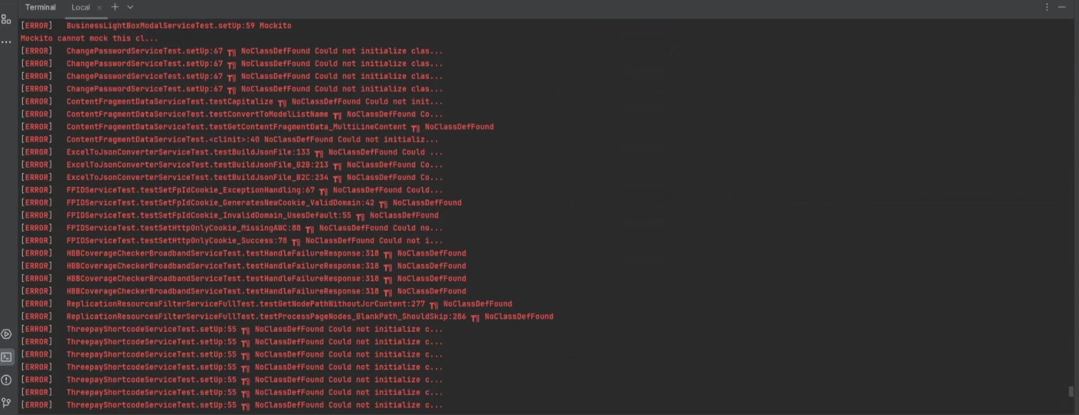 Previously, I was using JDK 11 and JUnit 4 in the AEM project source code, and all the core module test cases were passing. However, after upgrading to JDK 21 and JUnit 5, all the test cases started failing with several issues such as NullPointerException, NoClassDefFoundError, and others. For your reference, I have attached a screenshot.