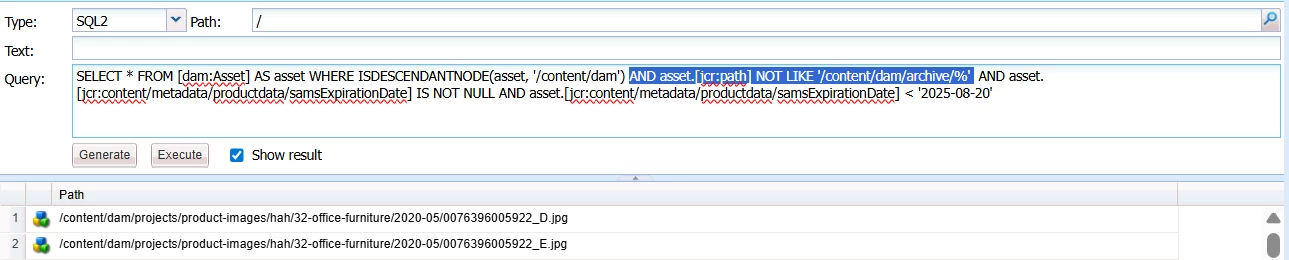 "AND asset.[jcr:content/metadata/productdata/samsExpirationDate] IS NOT NULL " +