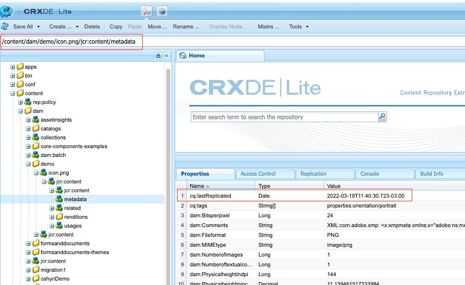 Is there a way to update the metadata LastReplicationDate of an asset through API or the CRX on AEM?