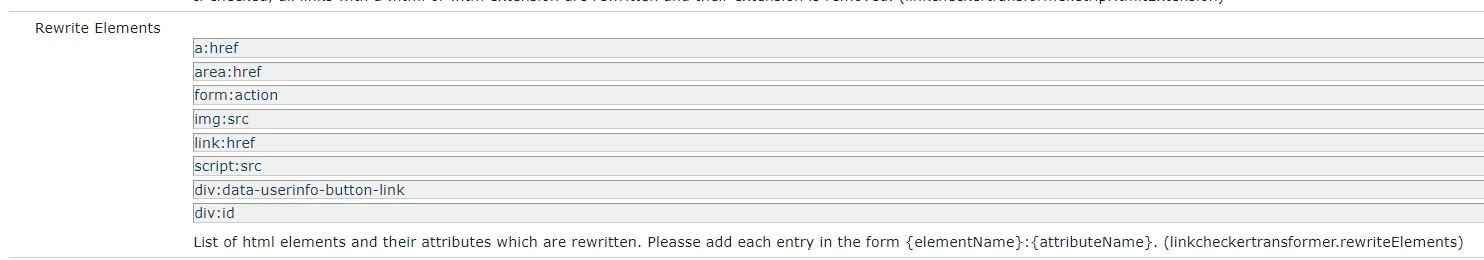 linkcheckertransformer.rewriteElements=["div:data-asset","div:some-attr","a:cust-attr","a:cust-attr2","a:href","area:href","form:action","img:src","img:srctest","link:href","script:src","img:testit","p:testit"]