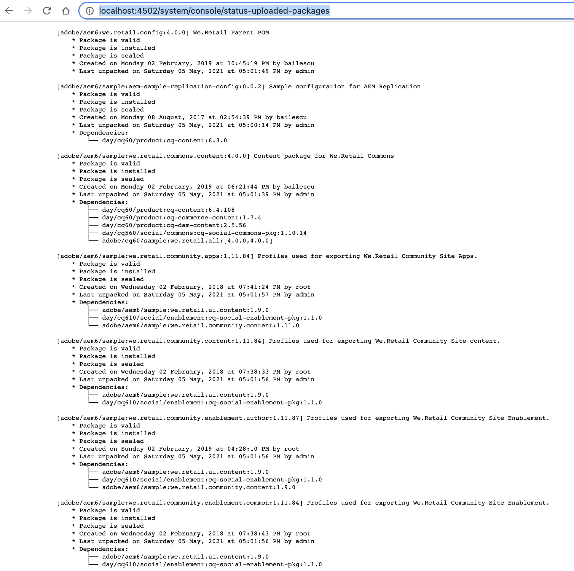 List out the Uploaded Packages and their status in AEM (6.5.10.0)