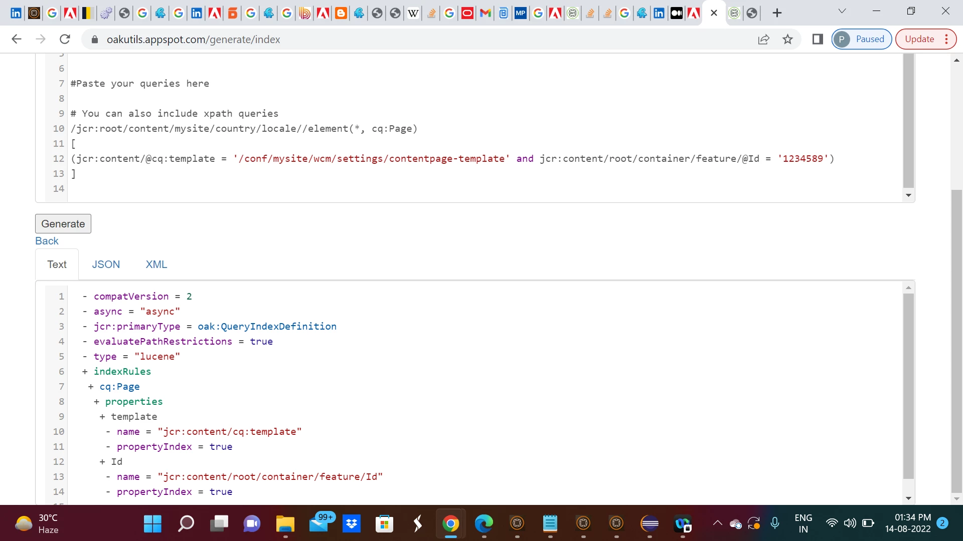Step 2: Please copy the above mentioned Xpath query and paste into Oak Index Definition Generator [https://oakutils.appspot.com/generate/index] as shown below -