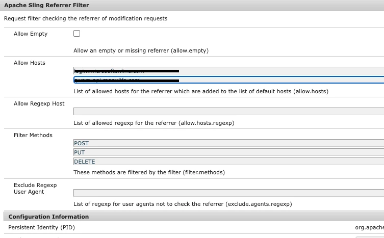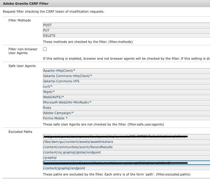We've added the excluded path to the Adobe Granite CRSF Filter and the allowed host to the Apache Sling Referrer Filter. Also we can make post requests to the API using Postman without any issues. Thanks for any advice.