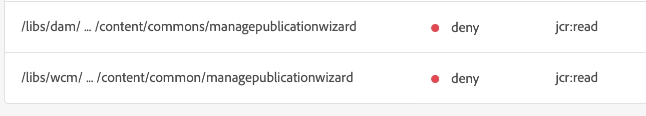 Recently, I am working on an requirement where I need to grant the publish access to a group users on a specific assets folder in Assets. So, I added crx:replicate privilege on the path of the assets folder for the user group, and then I can see the buttons of Quick Publish and Manage Publication, that is good. However, I find that Quick Publish is working for me, but Manage Publication is not working. When doing Manage Publication, it is throwing the error of "Not enough rights to manage publication.". By the investigation, I find it is lack of workflow relevant rights for Manage Publication. After I add the group to the members of the AEM built-in group of "workflow-users", Manage Publication is working in Assets. However, it is also visible and working in Sites pages (where I didn't add crx:replicate privilege), which is not expected.